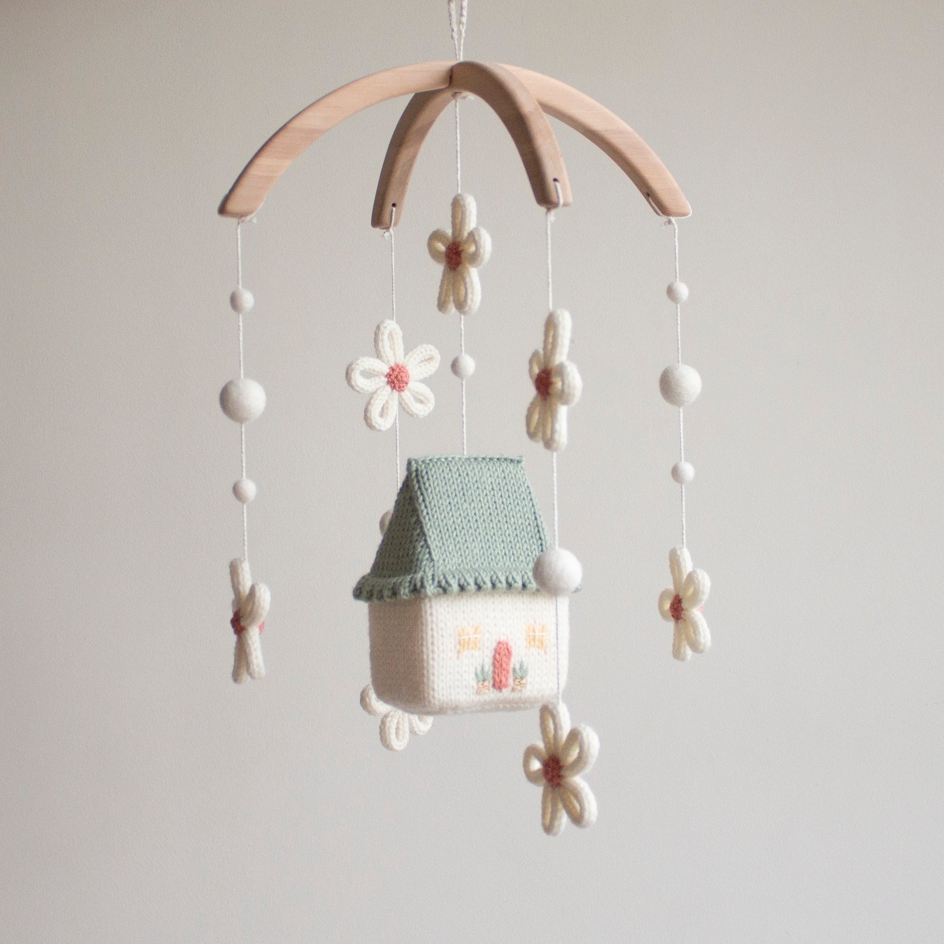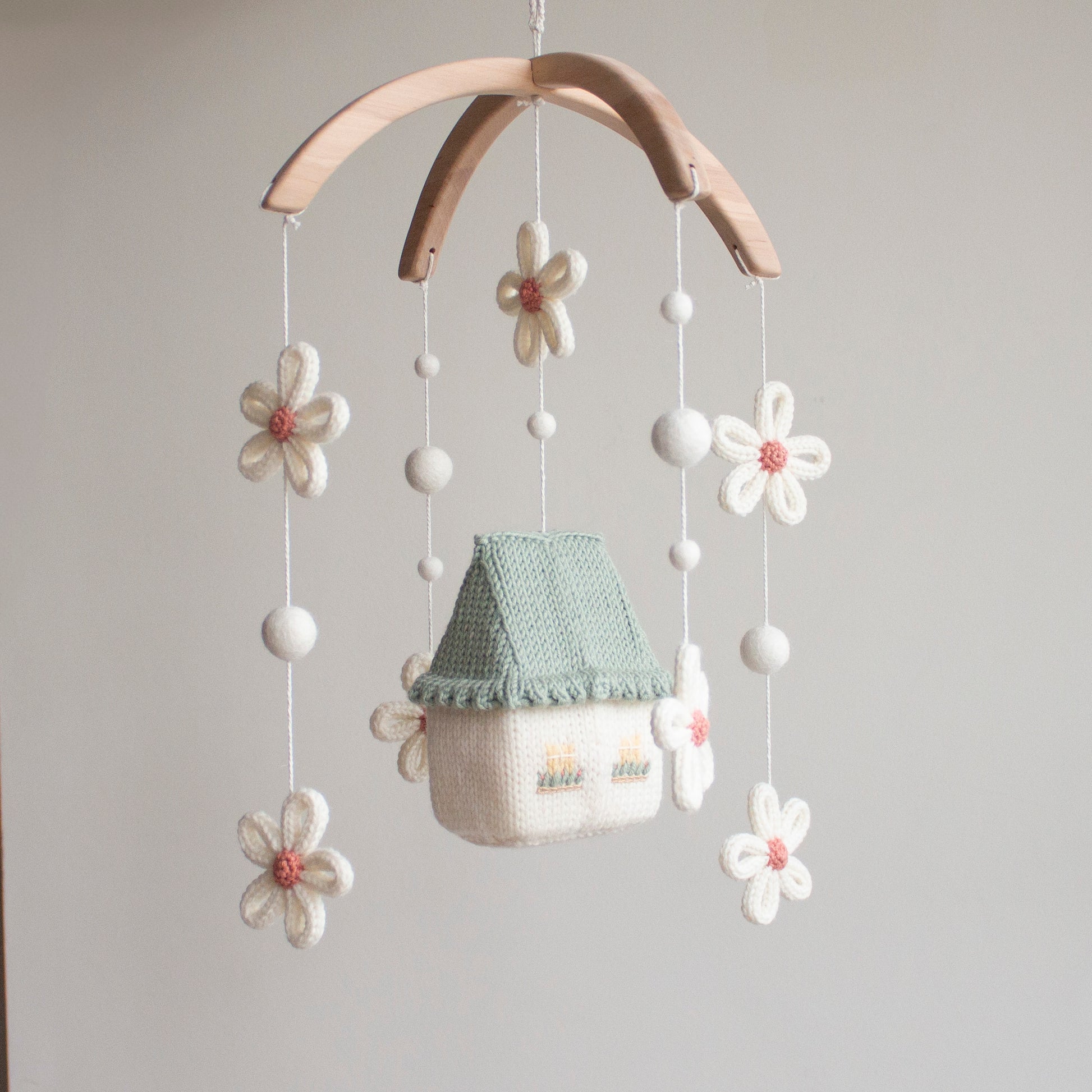• includes knitted house surrounded with floating daisies & wool balls, all suspended from a smooth wooden arch