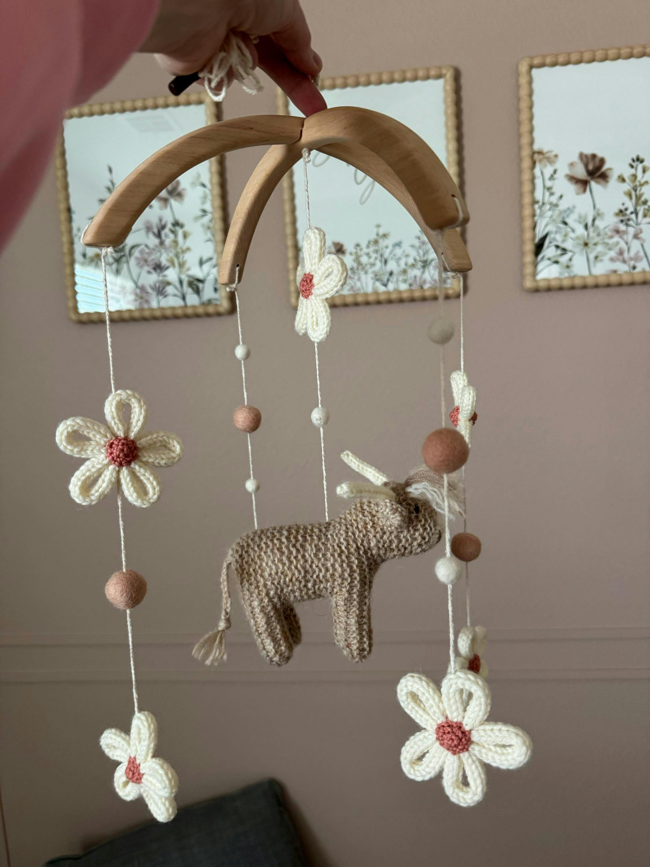 Baby mobile Cow & Daisies in beige & blush - Floral boho farm nursery decor - Highland cow crib mobile - Longhorn cow cot mobile