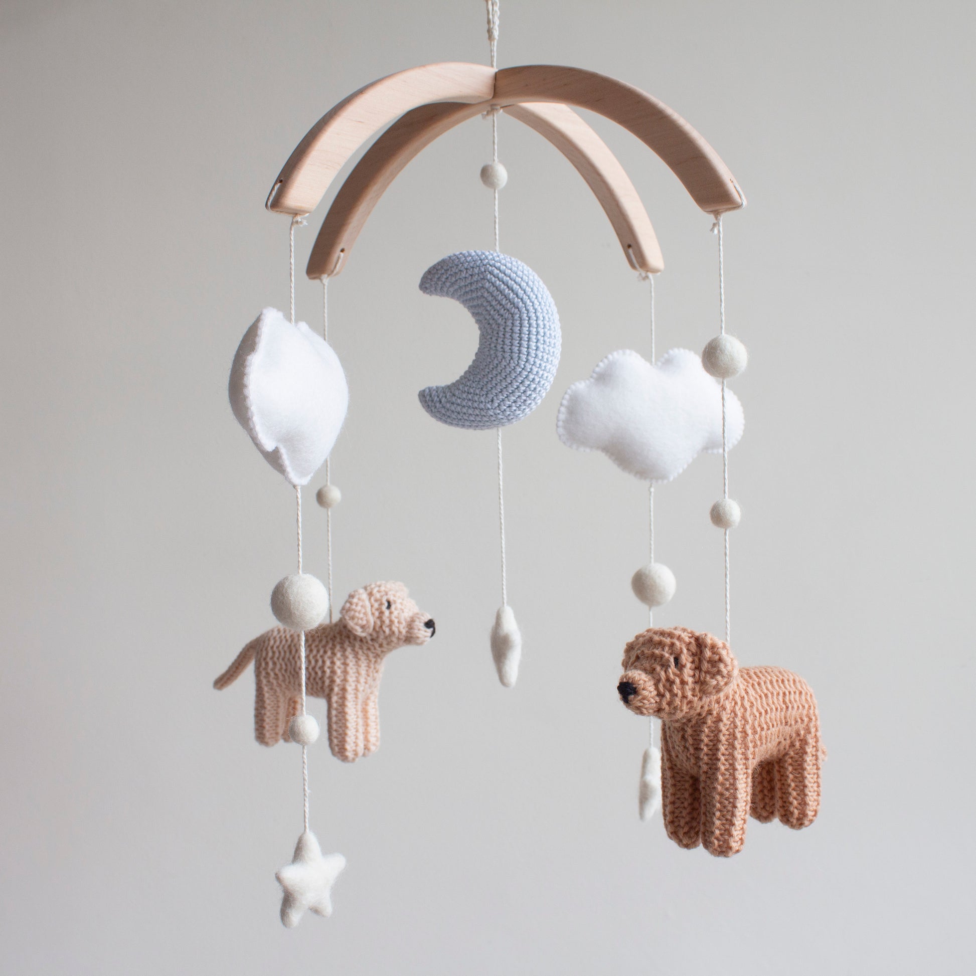 • includes two knitted Golder Retriever dogs designed, crochet Moon, wool felt clouds, stars and balls, all suspended from a smooth wooden arch