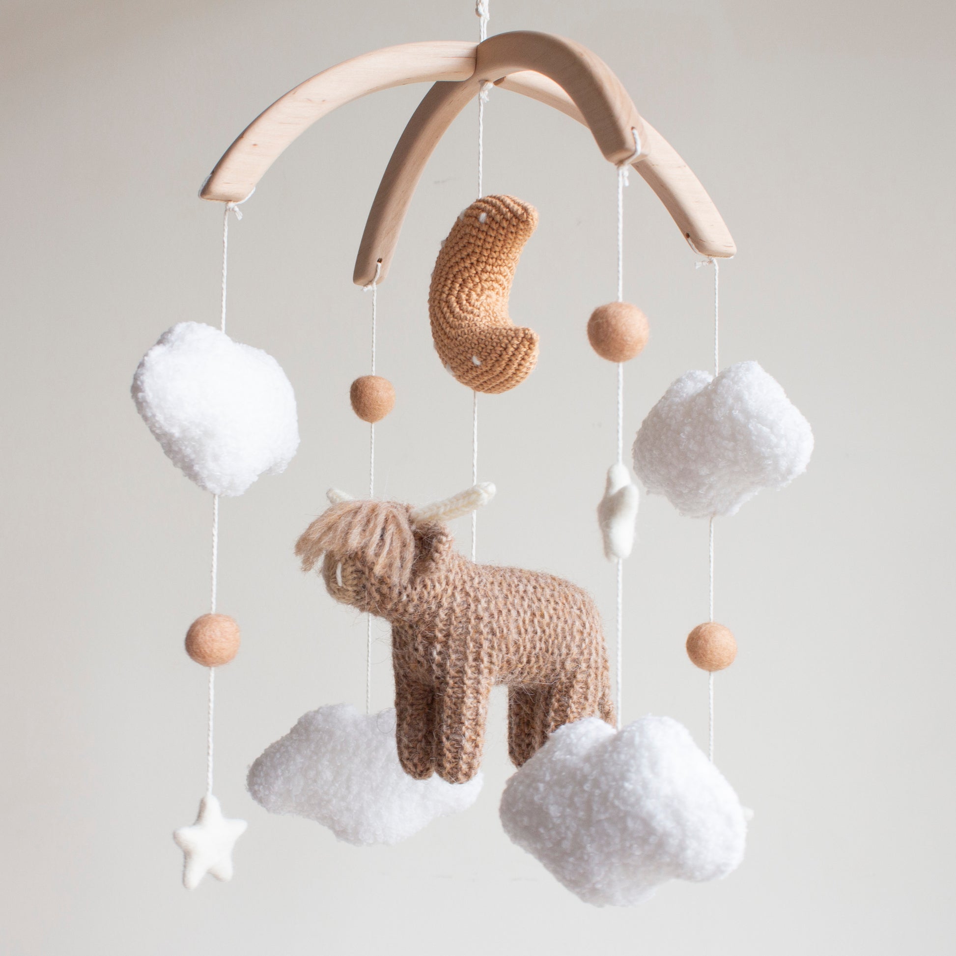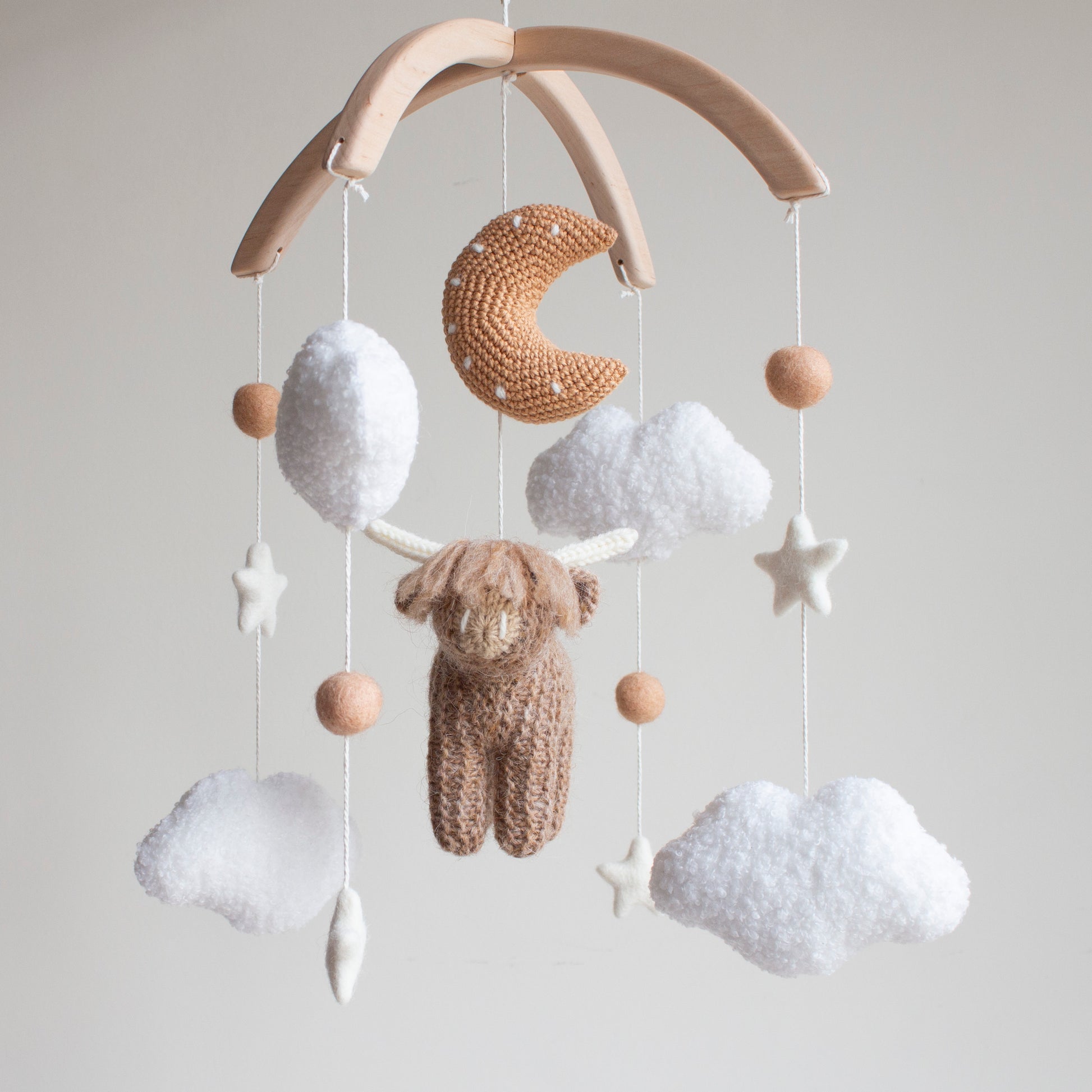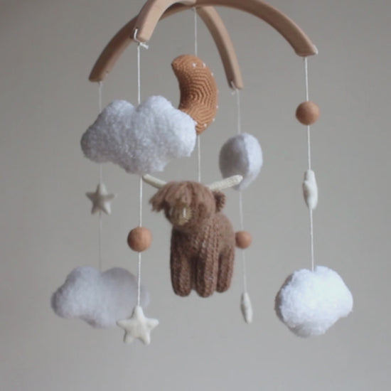 Highland cow baby mobile with boucle clouds, moon in earthy browns