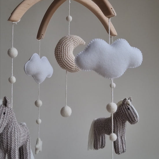 Create a peaceful and soothing atmosphere in your baby’s nursery with this handmade horse-themed mobile. Designed with soft, natural tones and gentle textures, it features two hand-knitted horses floating among dreamy clouds, twinkling stars, and a crocheted crescent moon — perfect for horse-loving families or anyone looking to add a sweet, serene touch to their baby’s space. The neutral color palette of warm greys, creams, and ivory complements any nursery style — from modern minimal to cozy rustic or boho.