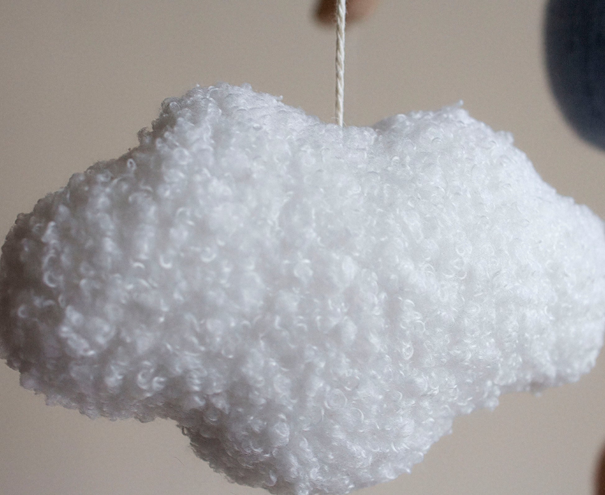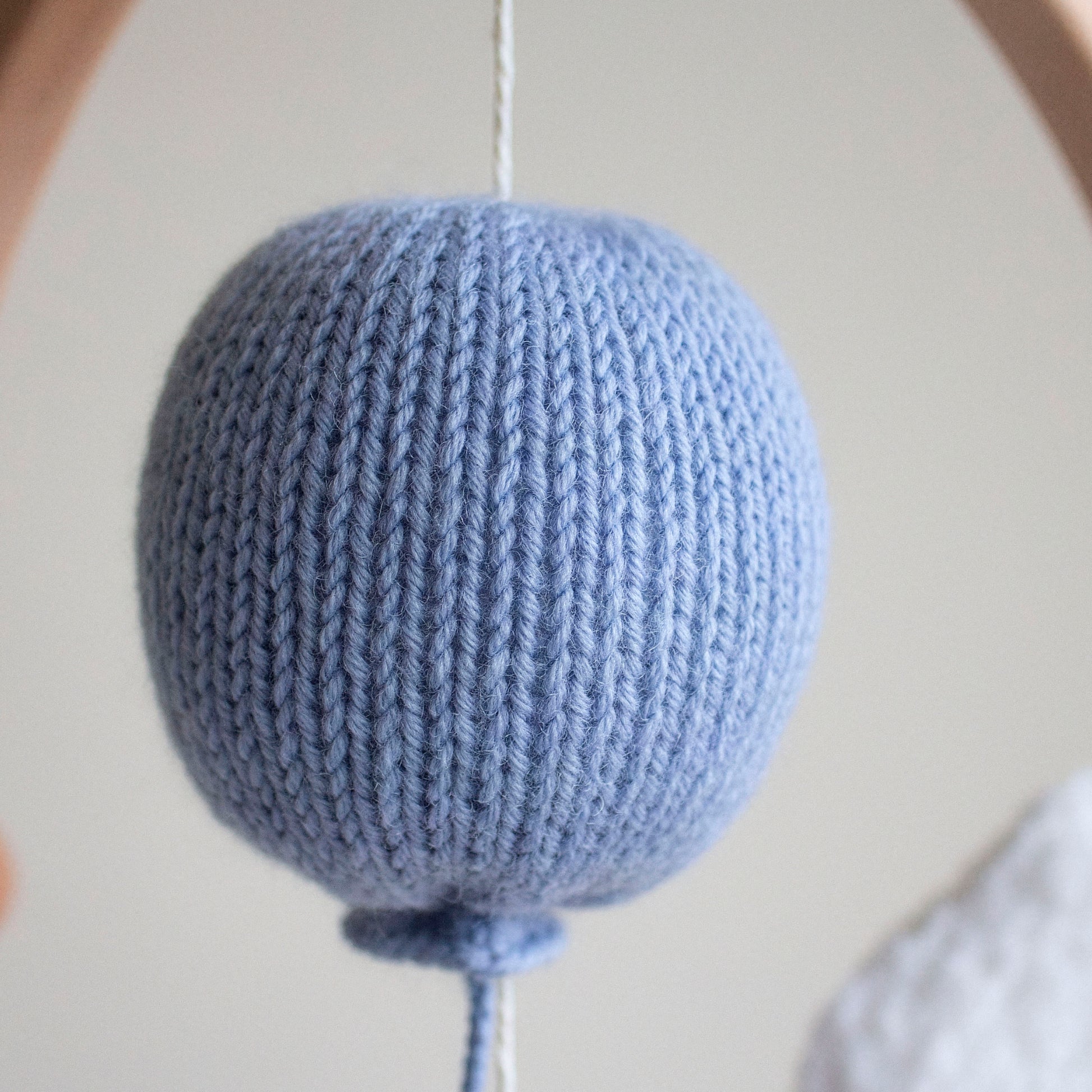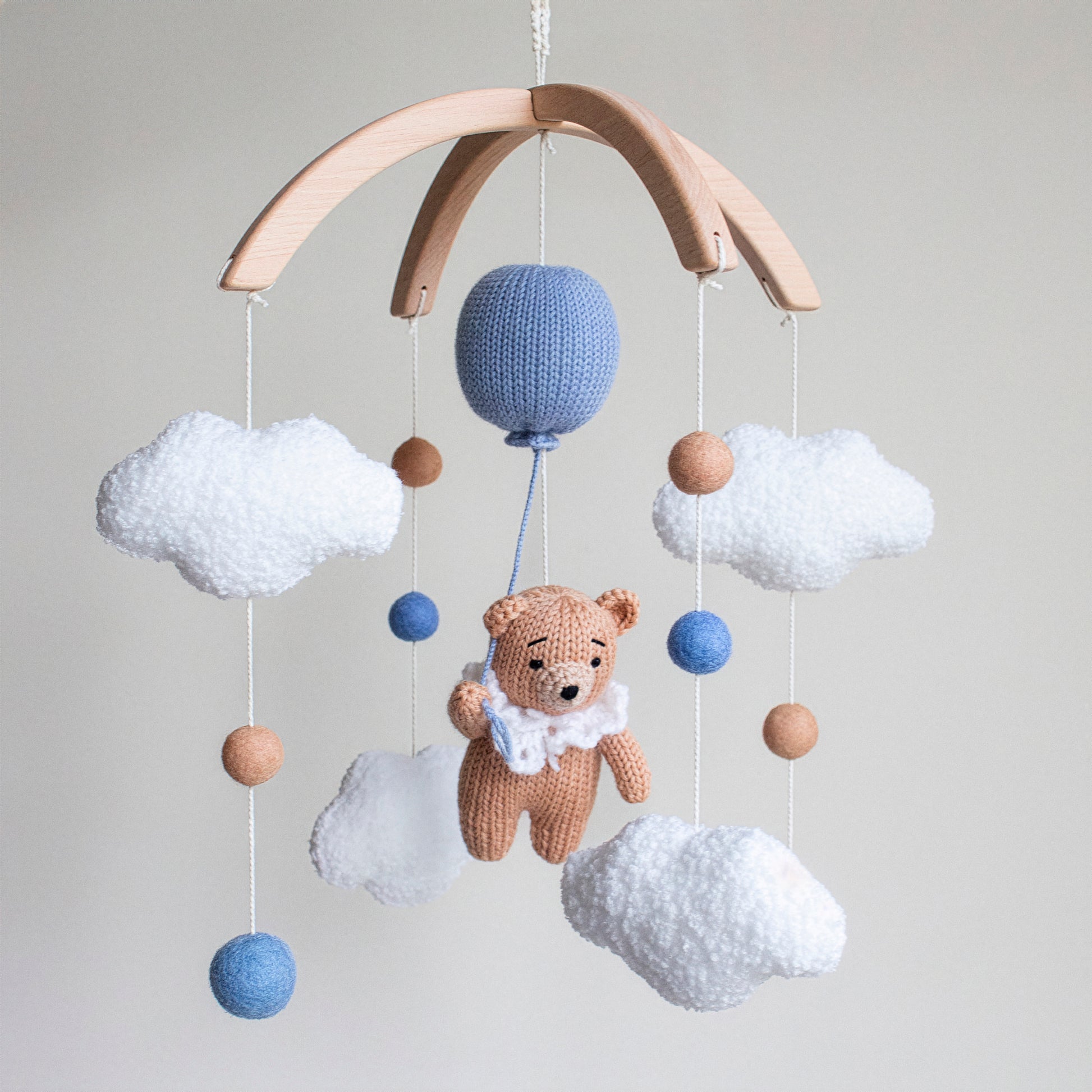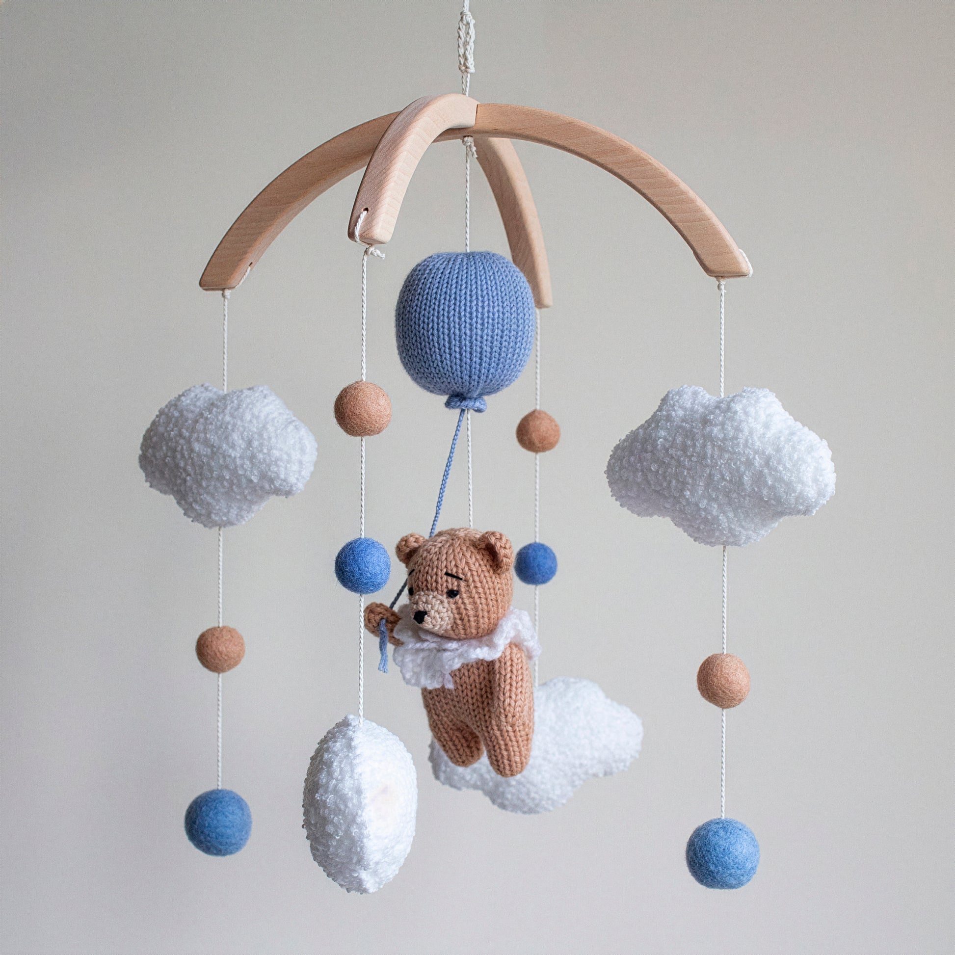 • includes hand knitted teddy bear, blue balloon, boucle clouds, and wool balls, all suspended from a smooth wooden arch
