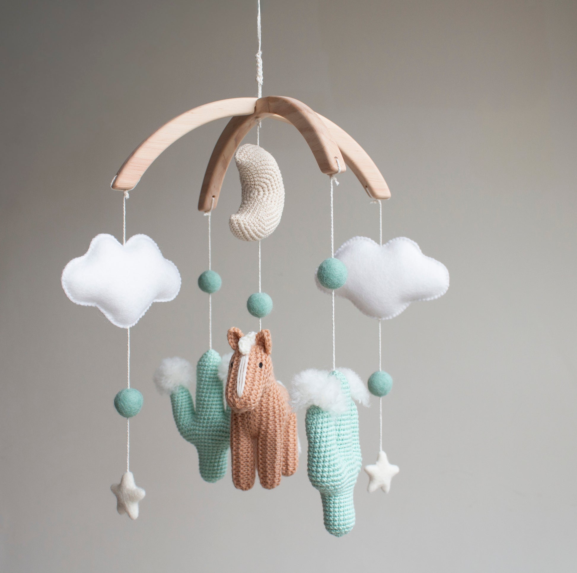 Details: Includes one hand-knitted horse, crochet moon & two cacti, wool felt stars, clouds, and balls, all suspended from a smooth wooden arch.